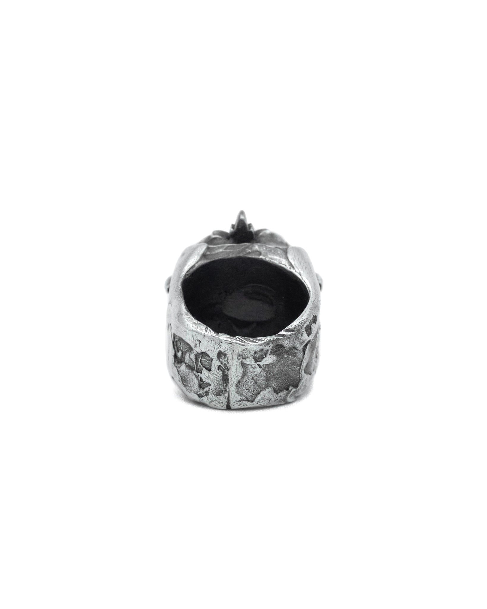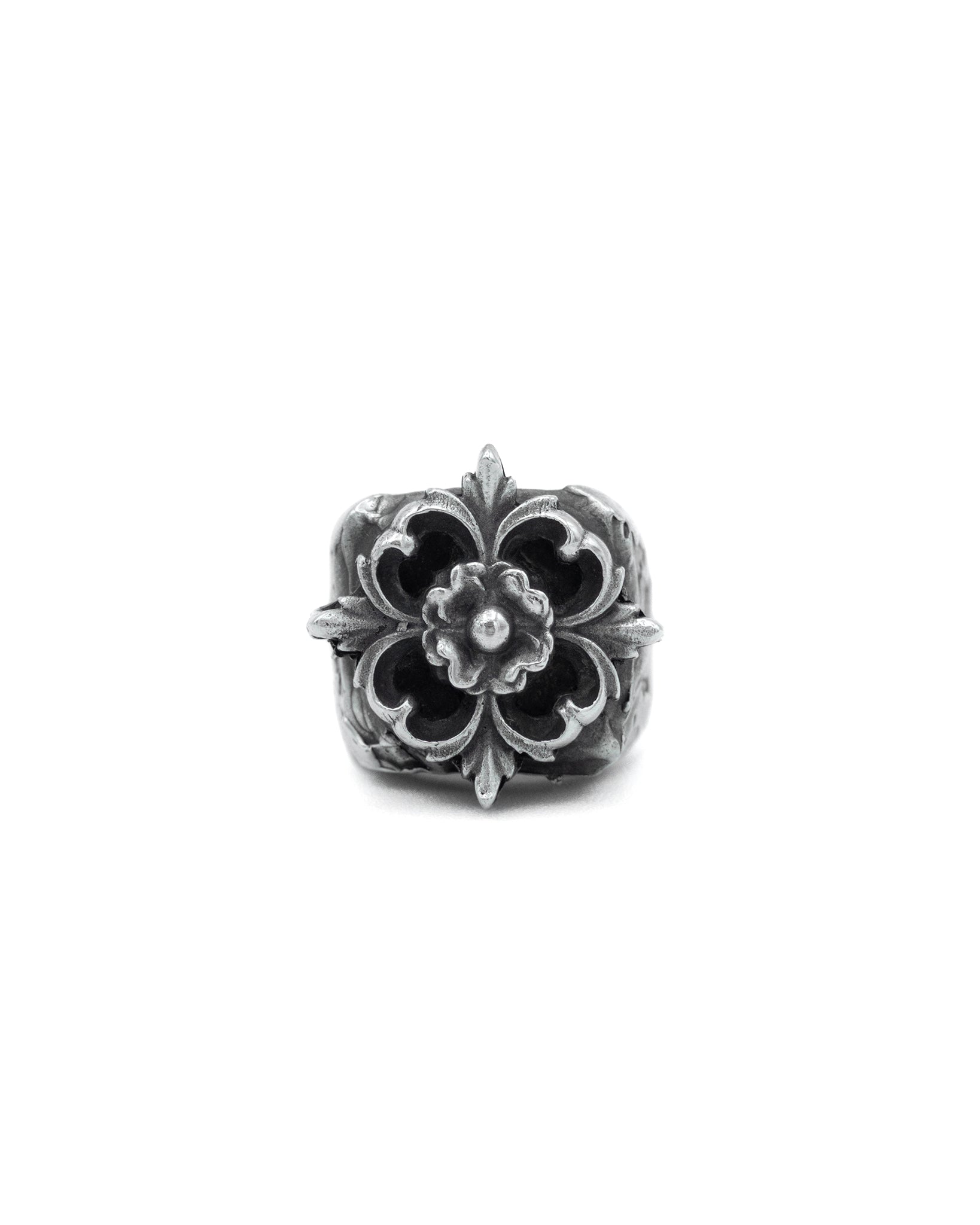 Heavy Square Signet Ring with Blooming Flower Logo and Distressed Texture
